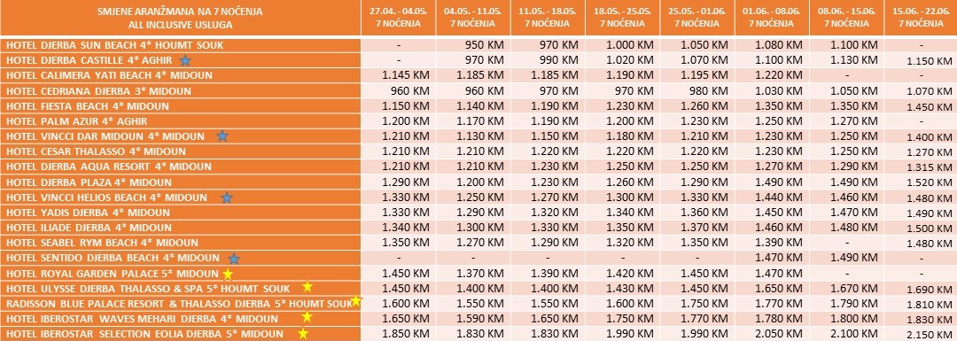 Sastanak putnika na Međunarodnom aerodromu Sarajevo, 2.30h prije leta /Nouvelair/ (planiran u 11:10h po lokalnom vremenu). Nakon prijave za let, pasoške i carinske kontrole, ukrcavanje u avion. Po slijetanju na otok Djerba, planirano u 12:25h po lokalnom vremenu, pristupanje pasoškoj i carinskoj kontroli te transfer autobusima do odabranog hotela. Početak usluga u hotelu prema pravilima hotela.