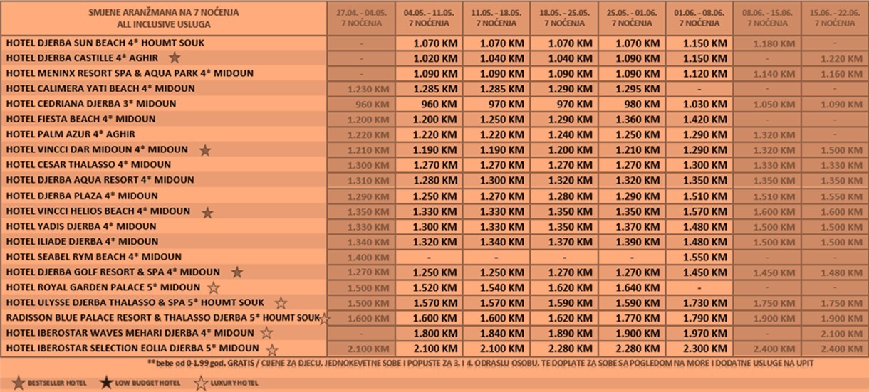 - Boravišna taksa 8 TND za hotele 3* i 12 TND za hotele 4* i 5* po osobi po danu (1 EUR = 3,3 TND); Plaćanje je na recepciji hotela, gdje su djeca do 11,99 godina starosti oslobođena plaćanje takse * Ministarstvo turizma Republike Tunis ima pravo u svakom trenutku da vrši korekcije cijena boravišne takse