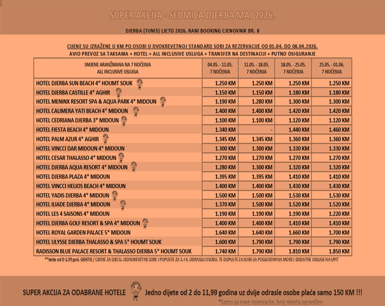 SPECIJALNA PONUDA ZA LETOVE U MAJU I REZERVACIJE NAPRAVLJENE OD 01.04. - 08.04.2026.