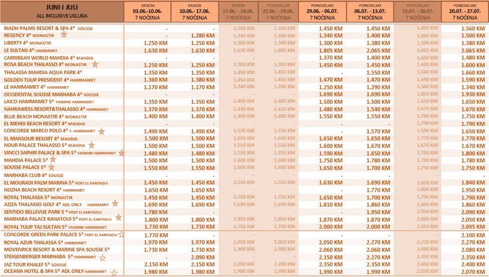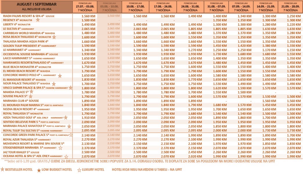 CIJENE U TABELI IZRAŽENE SU U KM, PO OSOBI, ZA 7 NOĆI SA ALL INCLUSIVE USLUGOM, I VRIJEDE DO 30.04.2026.: